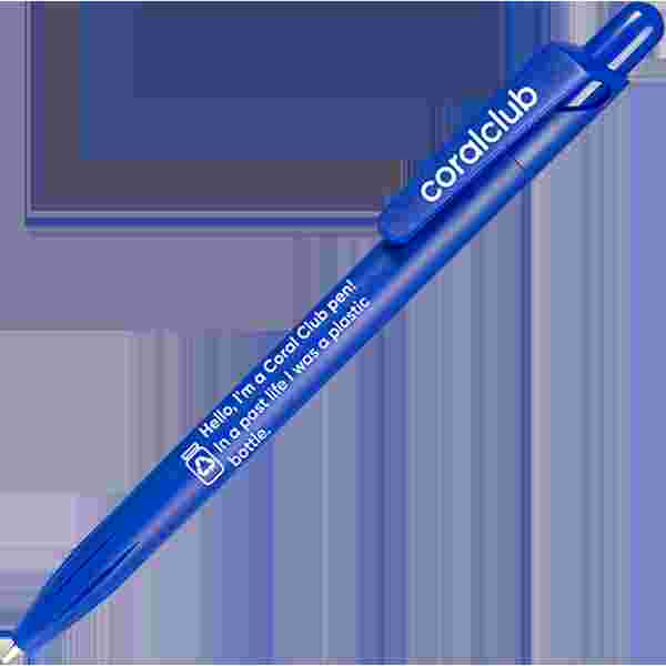 Bolígrafo con mecanismo de botón hecho de material PET-RECYCLED en el que pone " ¡Hola, soy un bolígrafo de Coral Club! En mi vida anterior, era un envase de plástico".